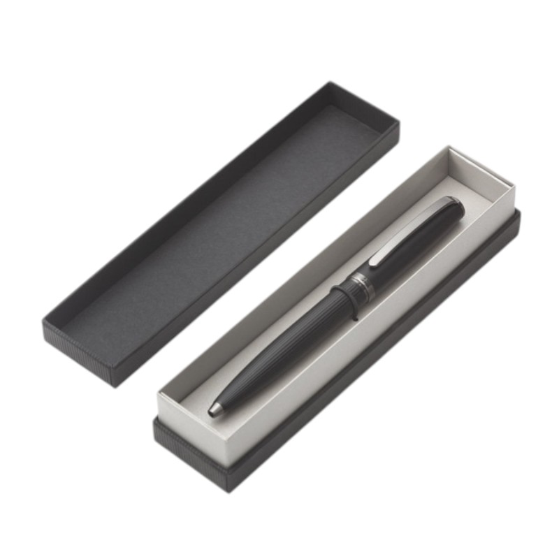 Metal. Cuerpo de aluminio. Bolígrafo retráctil. Clip, botón y anillos metálicos color plata oscuro. Tinta Negra. Destape electroplateado en ambas partes. Presentación en estuche con cierre magnético