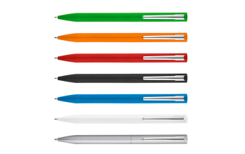 Bolígrafo fabricado en aluminio con mecanismo de giro, clip metálico con acabado cromado brillante. El cuerpo está lacado en acabado brillante. Tinta azul. Carga metálica con Tinta Dokumental® azul. Se suministra en estuche de regalo (desmontado).
