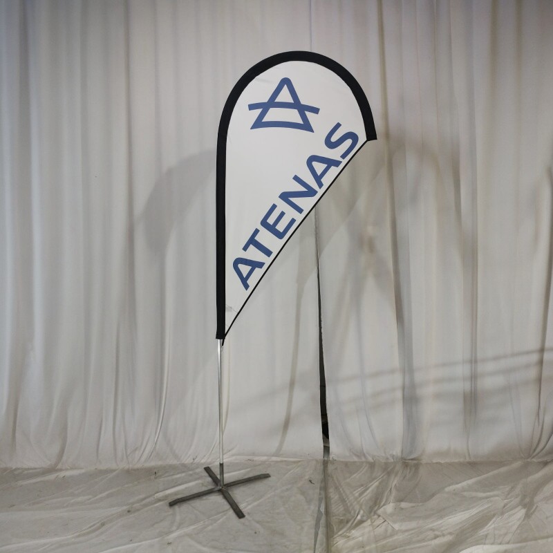 Fly banner confeccionado en tela 100% poliéster, de 150 gr. por m2 con pasa mástil. Impresos en sistema digital. Gira 360° como una veleta. La tela permanece extendida, y su mensaje siempre visible. Mástil desarmable de aluminio. Incluye funda de transporte.