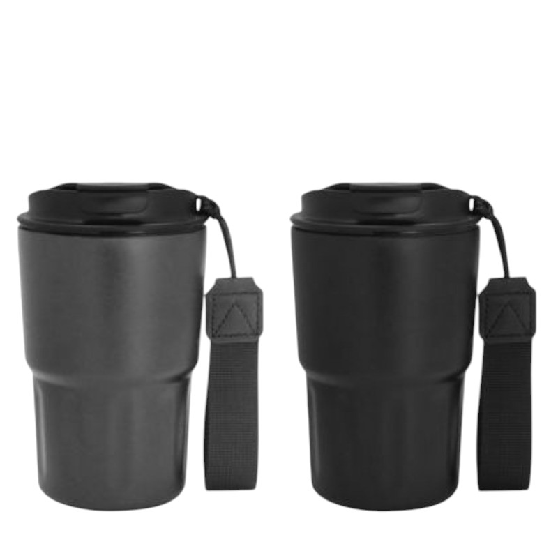 Vaso doble pared, sellado al vacío. Interior en acero 304 y exterior en acero 201. Tapa de polipropileno con anillo de silicona y correa de poliéster en color negro. Pintura acabado mate. Medidas: Ø 8,8 cm x 14,5 cm. Capacidad: 330 ml.