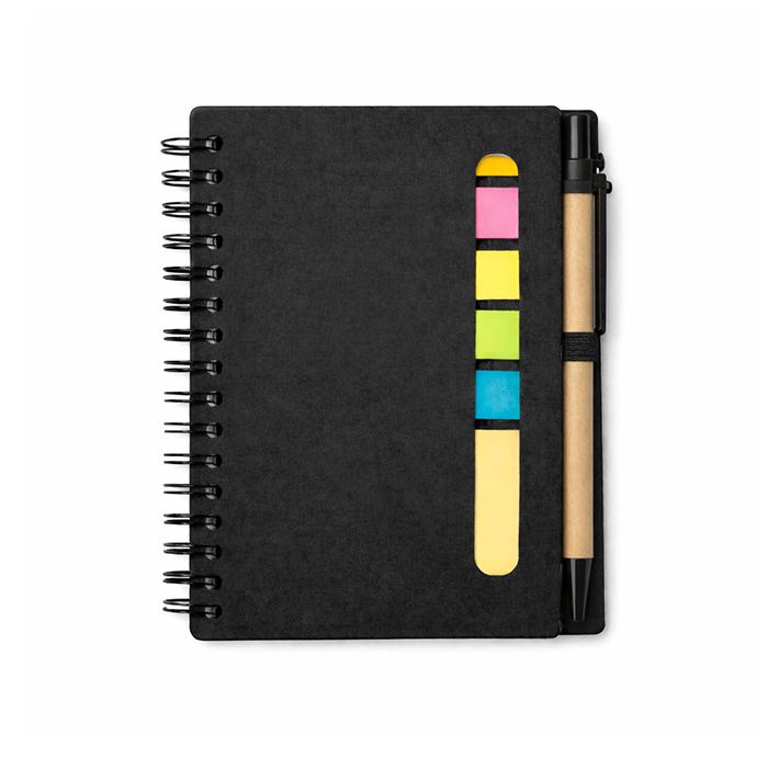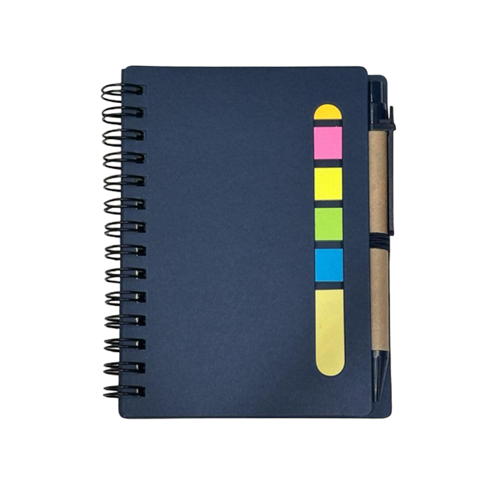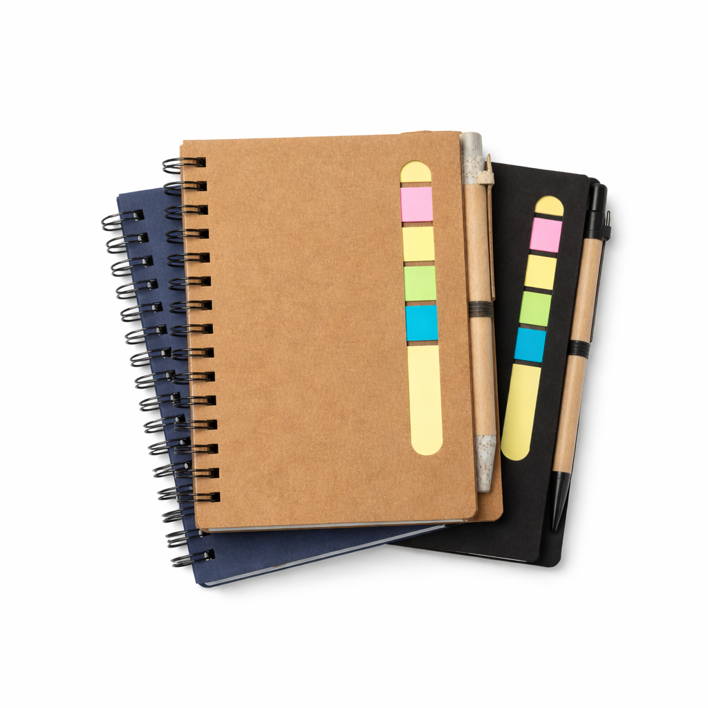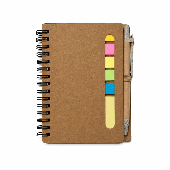 Libreta espiralada. Medida 11 x 13 cm . Contiene 70 hojas lisas color natural, con notas autoadhesivas de color y boligrafo.