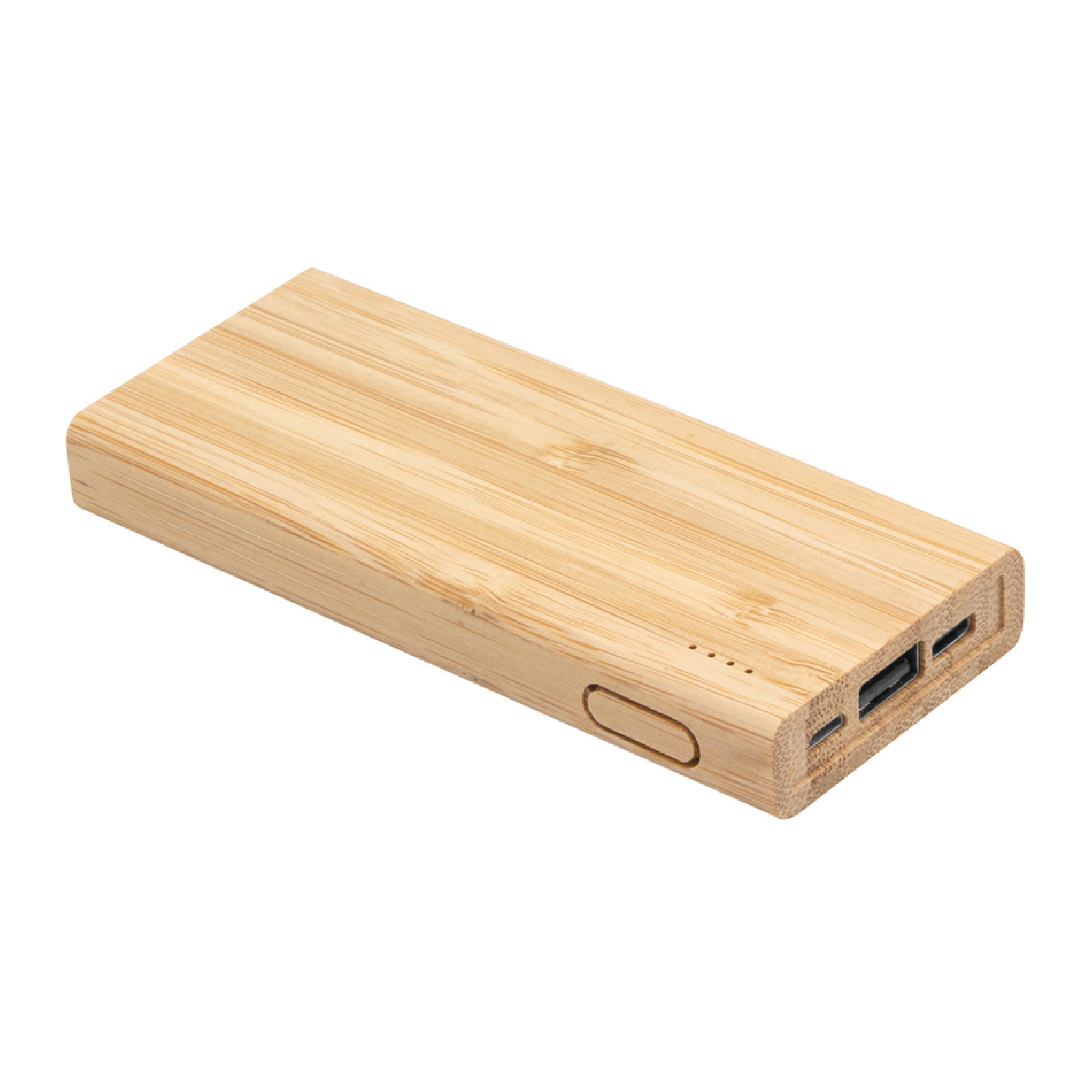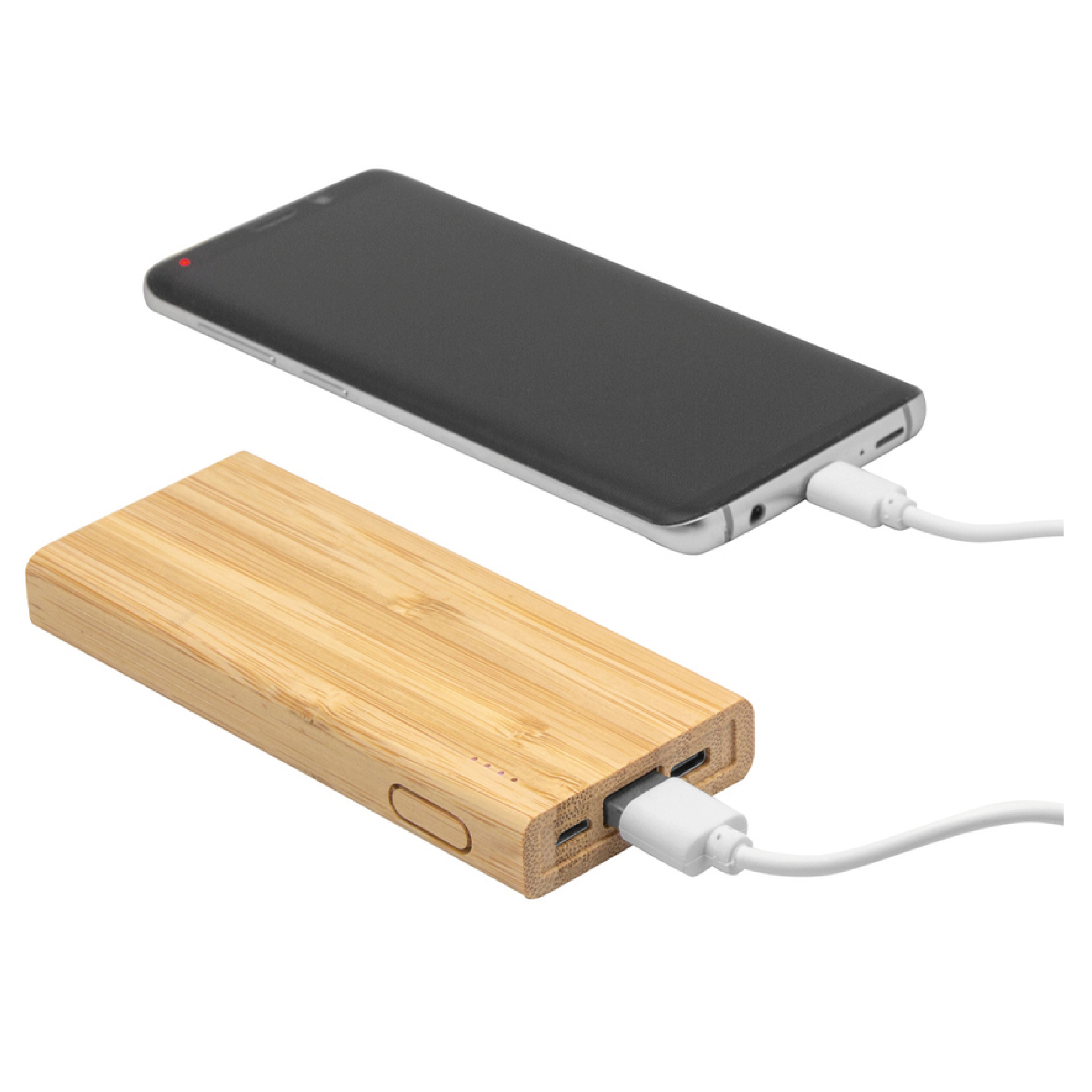 Power bank. Batería portátil con 1 puerto de entrada micro + 1 tipo C y 1 puerto de salida USB. Entrada y salida: 5V/2A. Indicador de potencia de 4 leds. Cable de carga USB tipo C de 30cm de largo en color blanco. Tiene múltiples protecciones: de carga y descarga, de sobrecarga y protección de corto circuito. Medida: 12 x 5,2 x 1,4 cm. Capacidad 5000 mAh. Bambú. Presentación en caja de regalo kraft.