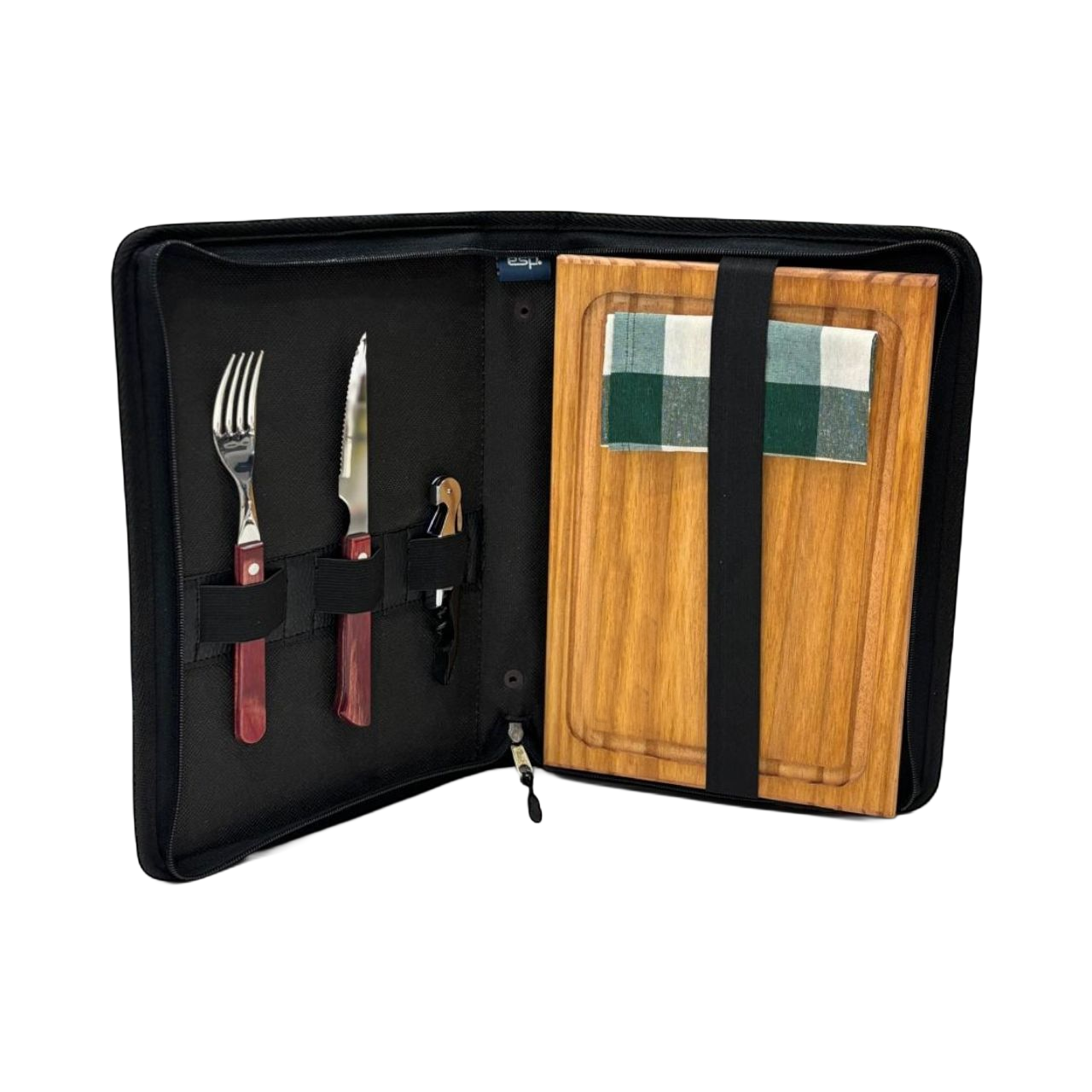 Set de asado combinado premium.Con estuche confeccionado en material simil cuero colores combinados. ribeteado en todo su perimetro. 33 x 23 cm estuche cerrado , incluye juego de cubiertos dynamic tramontina, tabla de madera de 20 x 30 cm y un destapador de dos tiempos, logo grabado en laser en plato de madera y en estuche.