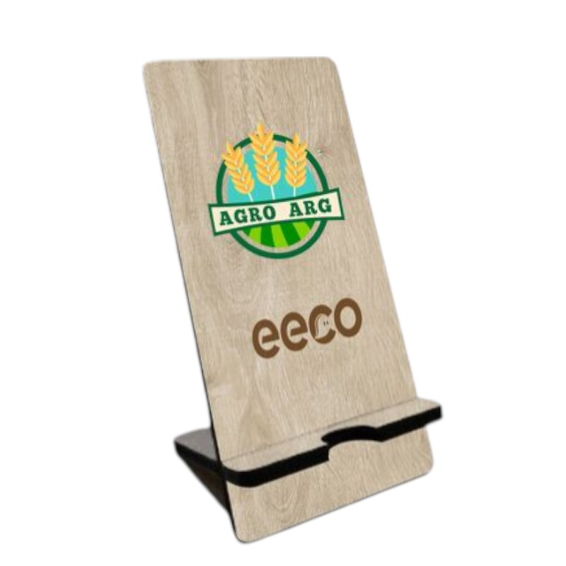 Soporte de celular de escritorio de madera de melamina de 5mm. Medida 16 x 8,0 cm. Aplicación de logo.
